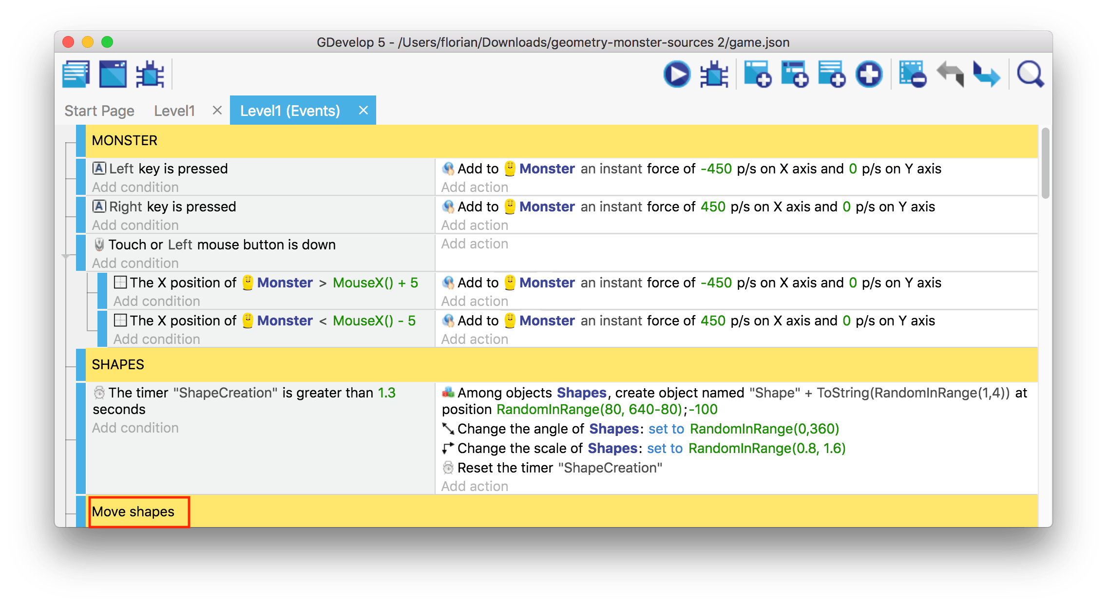 After successfully implementing the movement of the Monster it would be great to add the shapes that will be falling down, and move them down onto the scene.